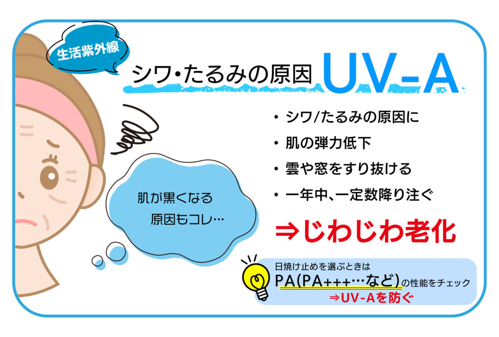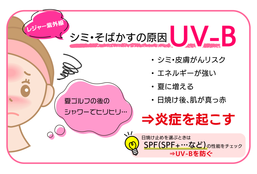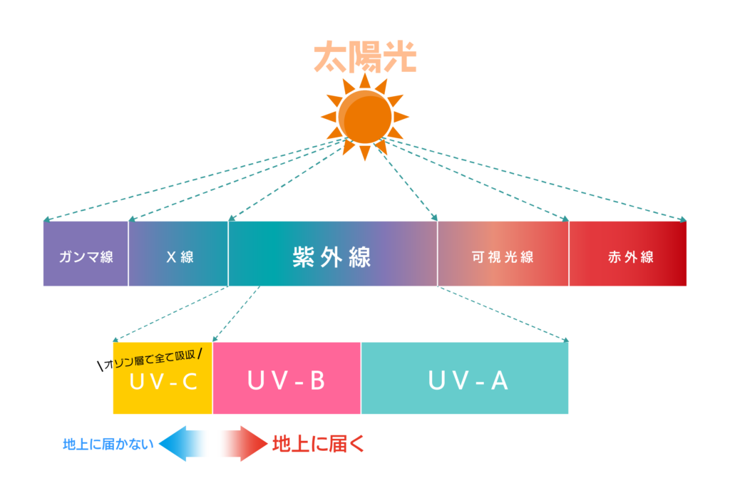 (UV-Cも存在しますが、オゾン層を超えて地表まで届かないため肌への影響は薄いとされています。)
